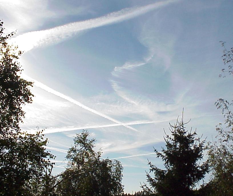 Wenn - wie z.B. für den 30.05.04 (Pfingstsonntag) aufgrund einer stabilen Hochdrucklage wolkenloser Himmel vorhergesagt wird, dann aber tagsüber 90-95% aller Wolken sich aus hunderten von gezielt erzeugten 'Sprüh-Kondensstreifen' entwickeln und gebietsverdunkelnd auswirken, und danach viele Menschen über seltsame Krankheitssymptome klagen, wäre dies ausreichend Grund genug, entweder endlich das Treiben von Sprühflugzeugen zur Kenntnis zu nehmen und es abzustellen, oder zumindest gründlich die Treibstoffzusammensetzungen aller wolkenbildenden militärischen und zivilen Flugzeuge daraufhin zu überprüfen: Wieweit erzeugen ihre Kerosinhaupt- und Zusatzstoffe (meist hochgiftige Additive im JP8) sowohl die künstlichen Dauer-Wolken als auch die sich häufenden seltsamen Krankheitsfälle? noch mehr Bilder http://www.chemtrails.erazor-zone.de/fotos/KN3005/)