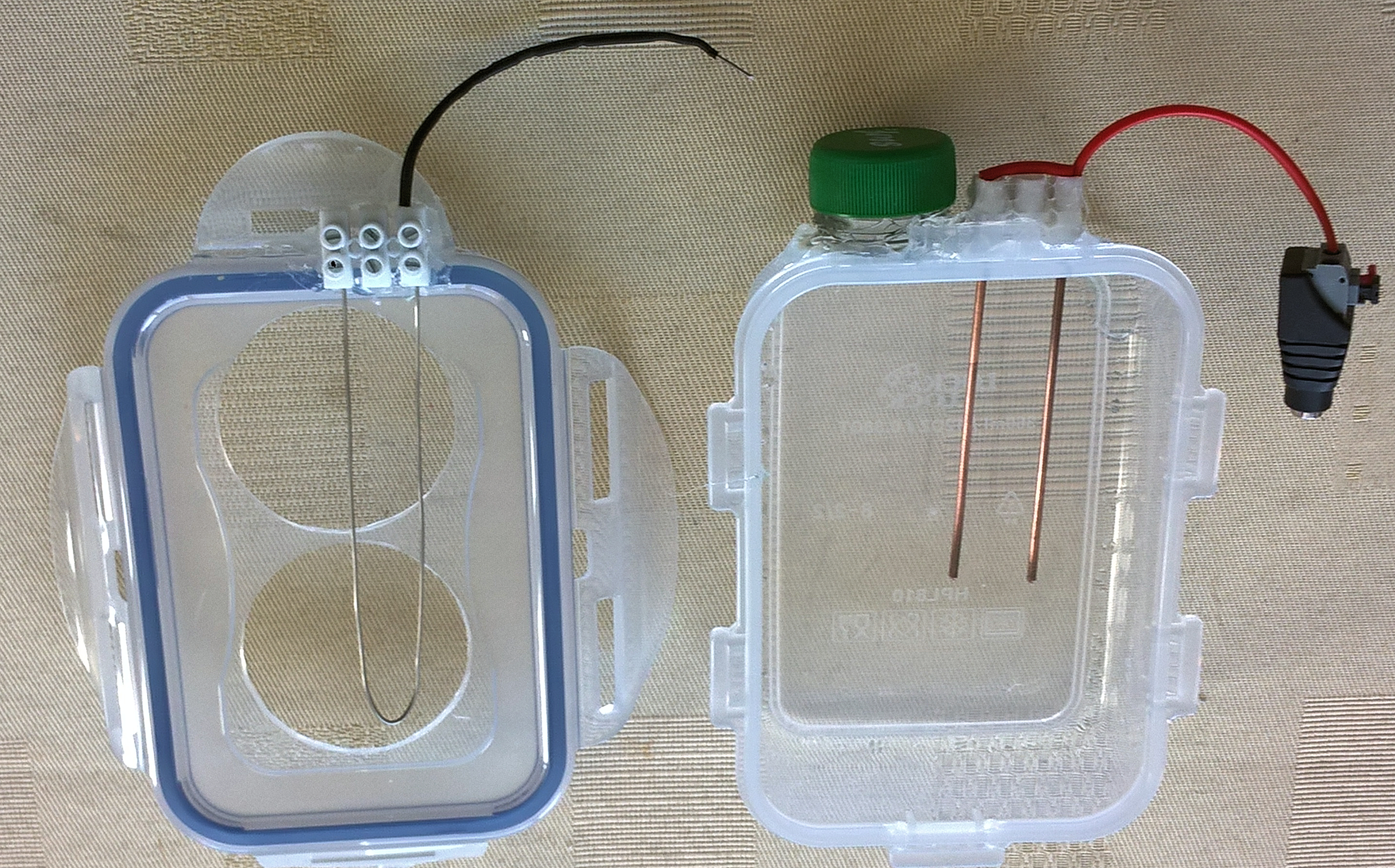 An sich genügt es, als Elektroden diesen Draht in U-Form zu biegen. Wenn der U-förmig umgebogene Draht in der Lüsterklemme befestigt wird, befindet sich kein angeschnittenes Drahtende mehr im Elektrolysewasser. Dann bleibt das Elektrolysewasser klar. Sind dagegen Anschnittkanten im Wasser, dann lösen sich Eisenionen auch aus einem Edelstahldraht und verfärben das Wasser in der sauren Anolytkammer aufgrund der Eisenoxidation rasch rostbraun. Die relativ dünnen Edenstahldrahtelektroden sind rascher und sicherer in den Lüsterklemmen zu befestigen, wenn die Drahtenden mit einer Spitzzange zu einer möglichst kleinen Rundung geformt werden. Man könnte statt eines geraden, U-förmig umgebogenen Edelstahldrahtes auch einen gewellten Draht in U-Form verwenden. Dessen Formung ist aber zeitaufwändig, benötigt zusätzliche Werkzeuge und nicht zuletzt Bastlergeschick. In früheren Beschreibungen ging ich näher darauf ein, aber Anwenderrückmeldungen zeigten, dass seine Formung für die Meisten doch zu kompliziert war. Die nun beschriebene einfache Version zeigt zwar etwas geringere Effektivität bei der H2-Herstellung, aber für die Praxis ist das irrelevant. Anbringung: