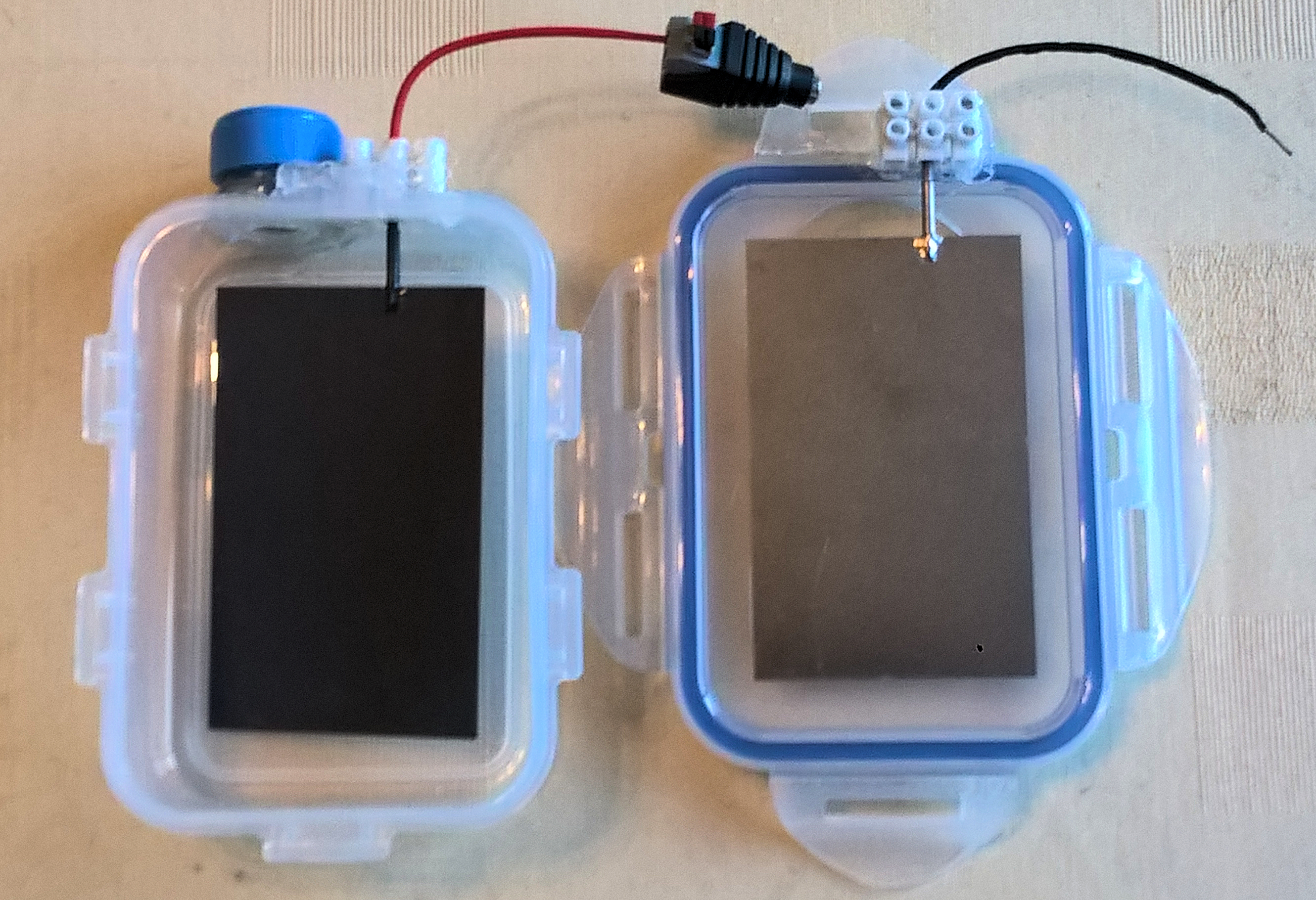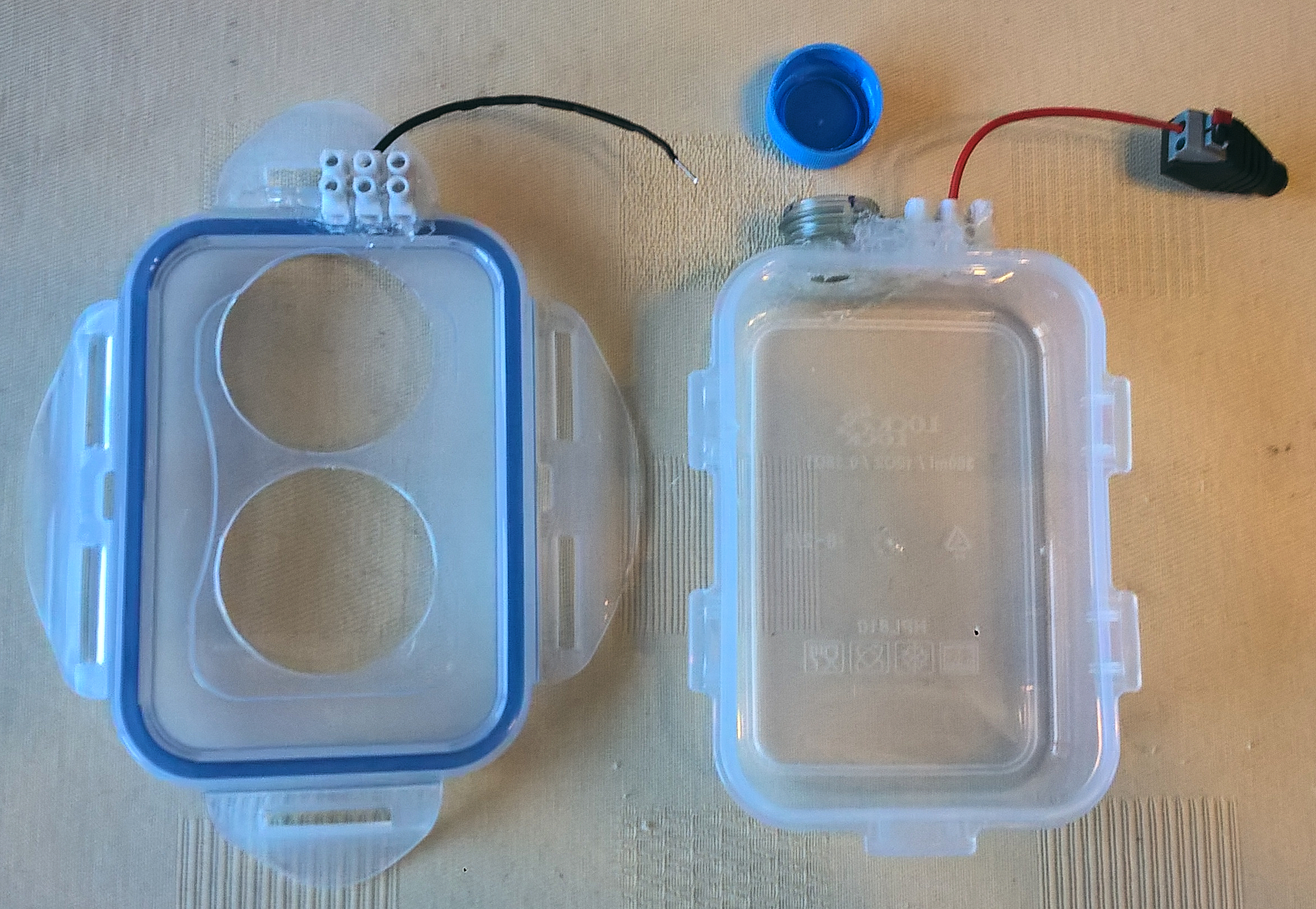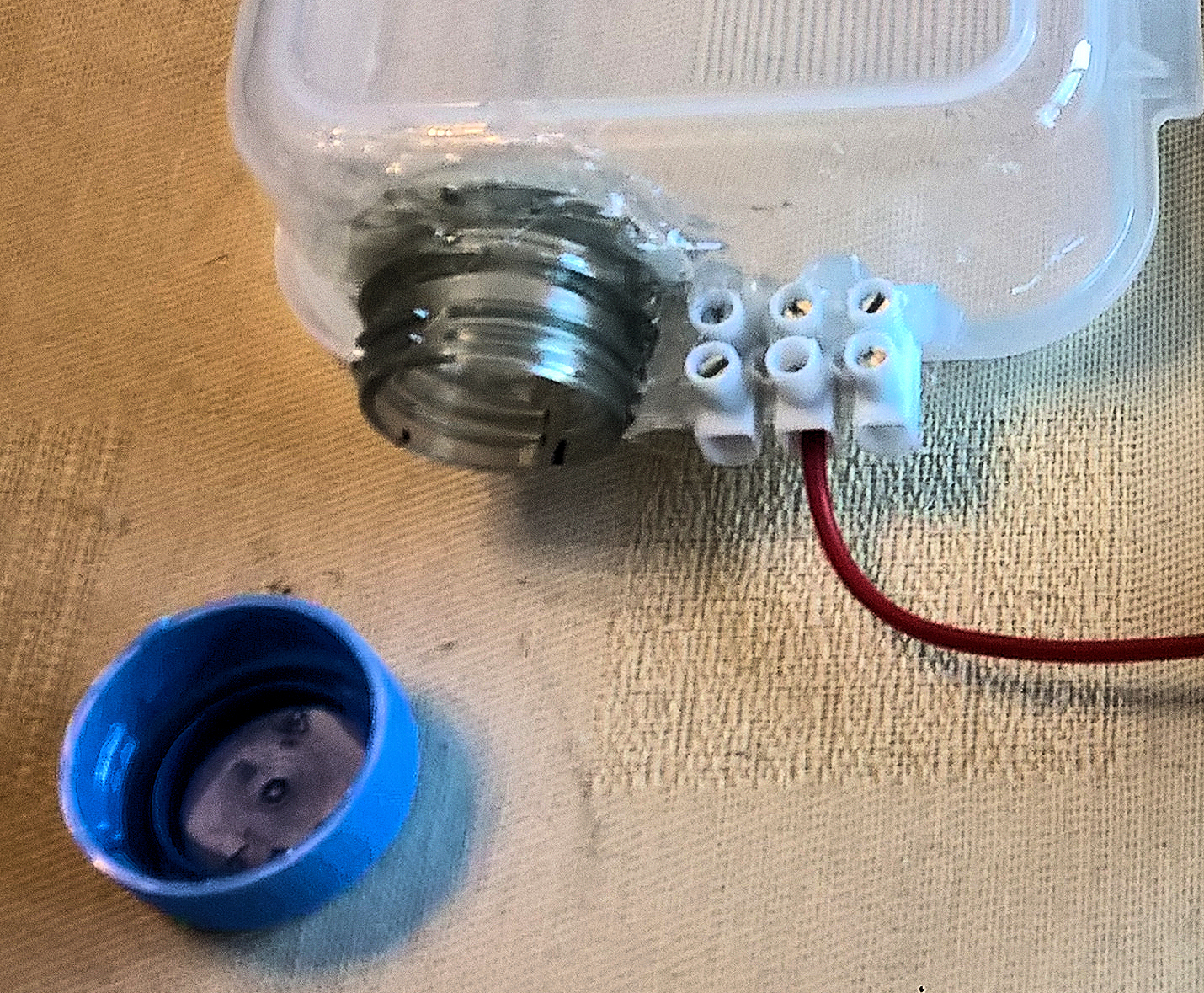 Bildteil rechts: Unterteil der 360 ml-Dose mit 3er Lüsterklemme für Anoden-Elektrode mit rotem Plus-Pol-Kabel Beide Kabelenden werden in den Hohlstecker eingeführt und darin festgeklemmt.