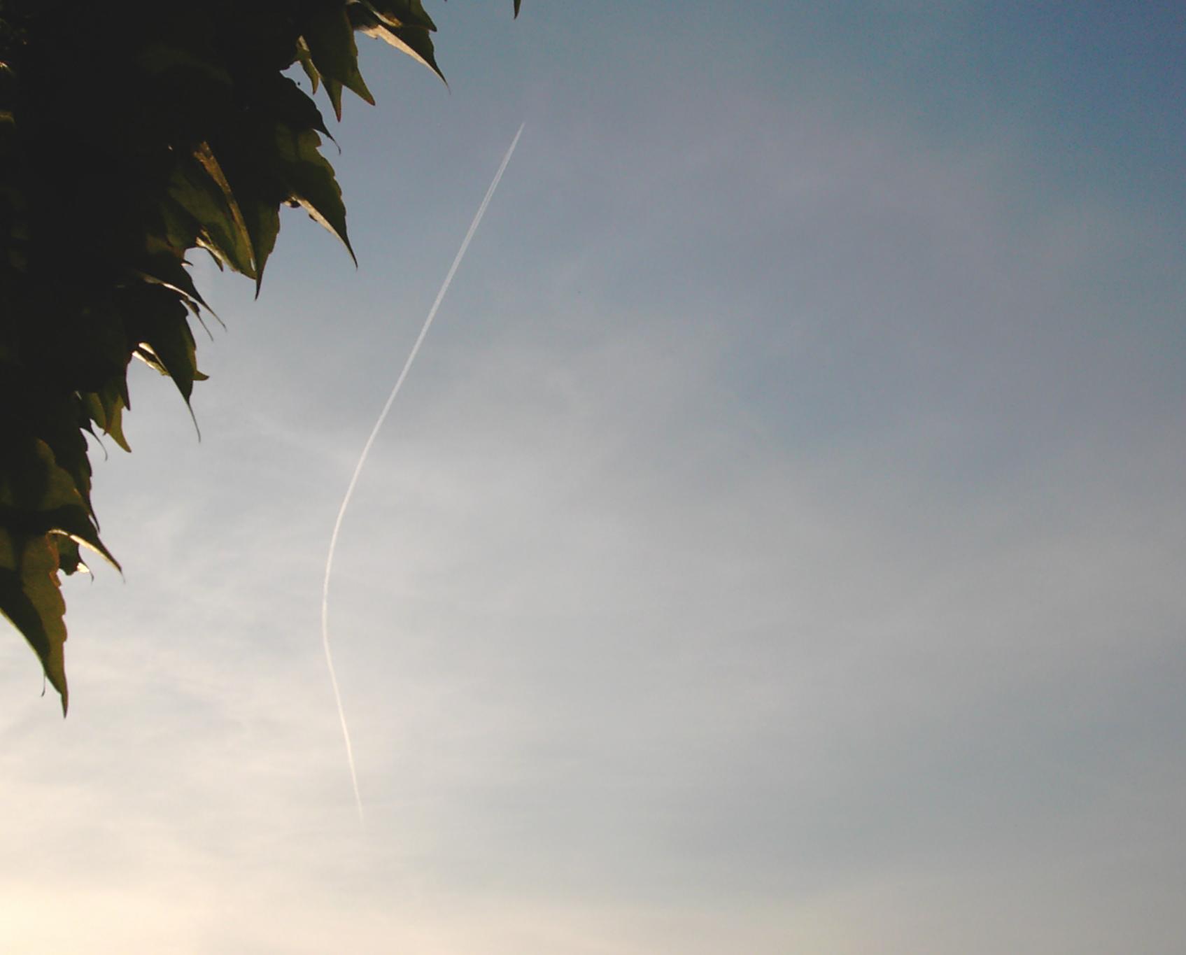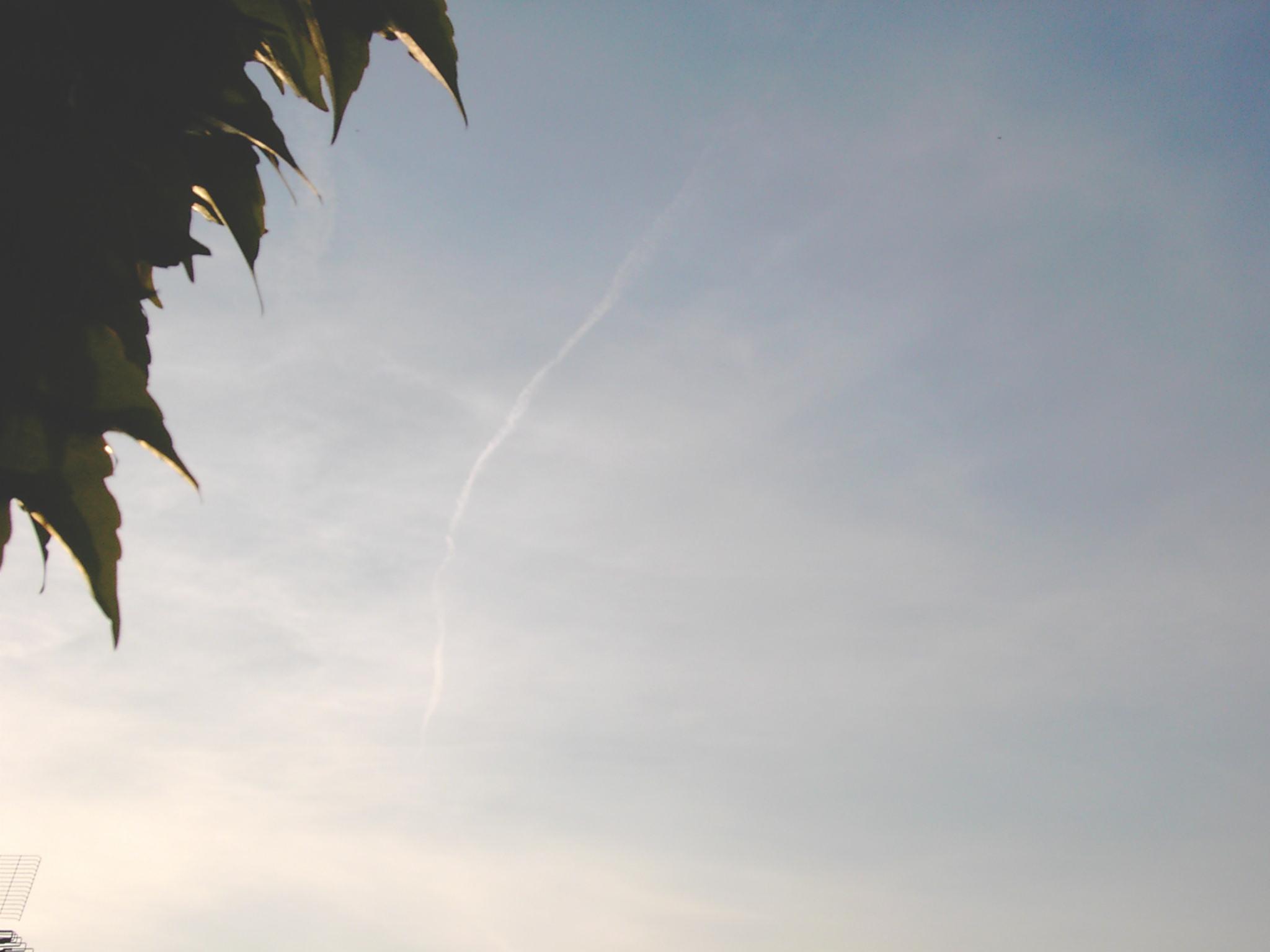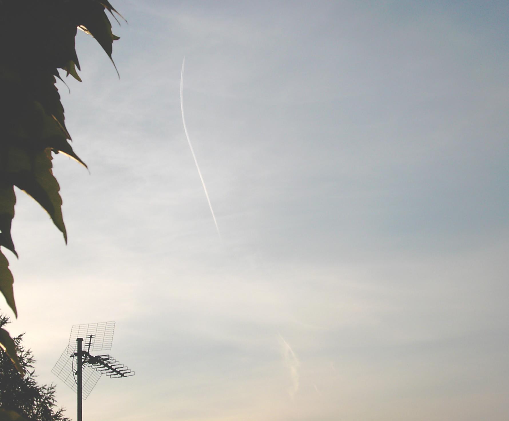 10.06.04, 06Uhr21-40: 6 Min. später ist von der Flugspur nur noch der untere Teil (Antennenhöhe) übrig = Hinweis auf kurzzeitiges Chemtrailsprühen in den Kondensstreifen hinein.
