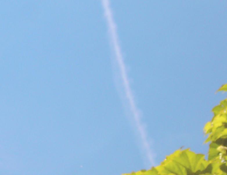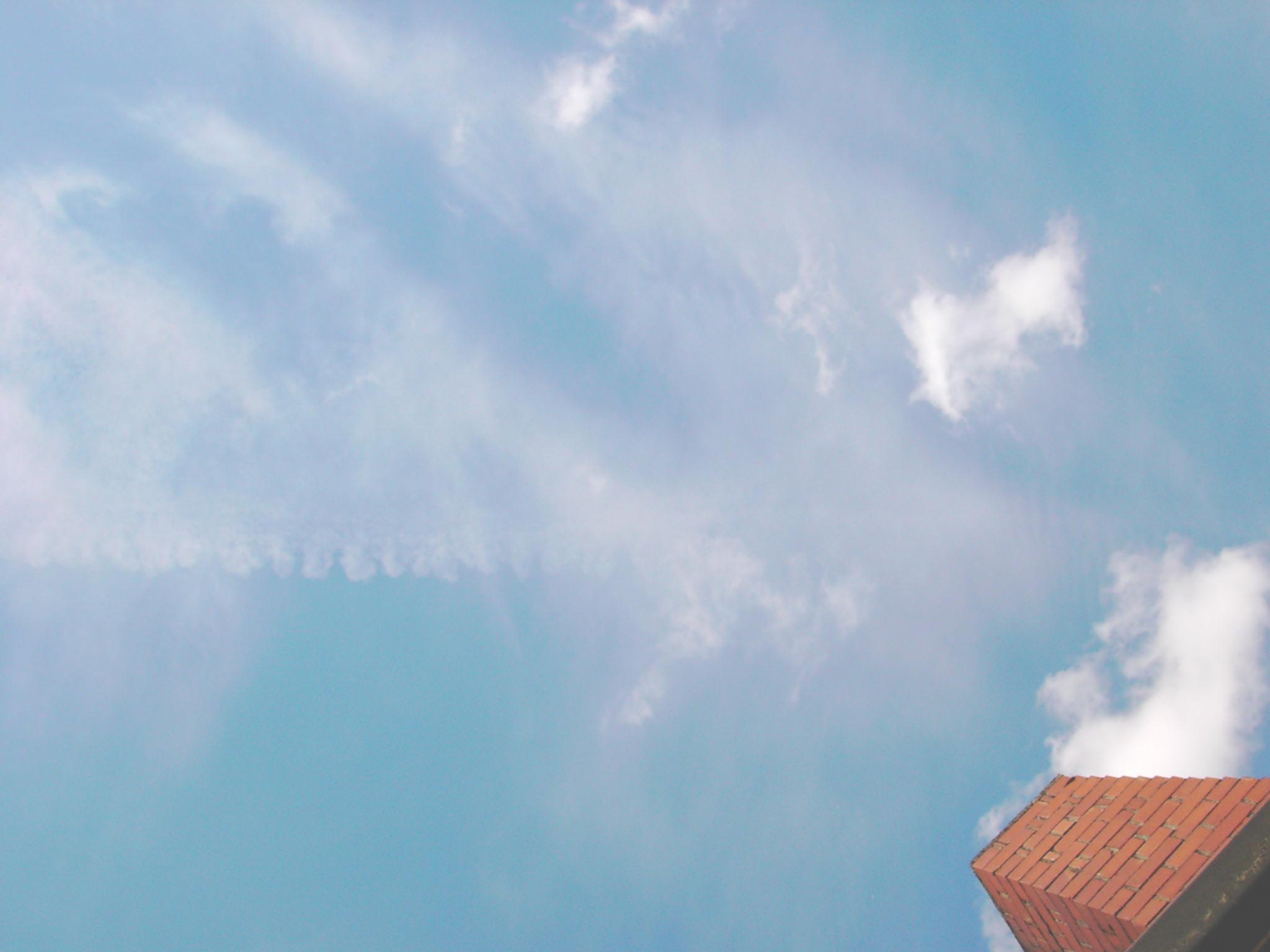Die zunächst pilzartige, sehr deutlich-auffällige Ausblähung des nachfolgend in ganz kurzen zeitl. Abständen fotografierten Chemtrails ging nicht nur erstaunlich rasch (ca. 20 Min.) in einen formlosen grauen Nebel über, der sich mit anderen hellgrauen Chemtrails-Nebeln vereinigte. Es wirkte so, als ob die Chemikalien dieses Chemtrails eine katalytische, zersetzende Wirkung auf natürliche Wolken hätte... Weitere Beobachtungen in dieser Hinsicht sind wohl angebracht.