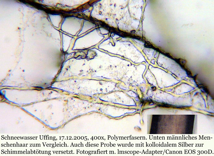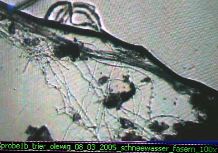 Die Mikroskopuntersuchungen von Schneewasser- und Regenwasser-Proben durch Christian Diebel verdient nicht nur besondere Beachtung, weil sie von verschiedenen deutschen Orten stammen. Wichtiger dürfte sein, daß die fotografieren Polymerbestandteile und kristallartigen Rückstände nach dem Verdampfen der flüssigen Proben wichtige Beiträge zu den Risiken der Feinstaubbestandteilen liefern können.