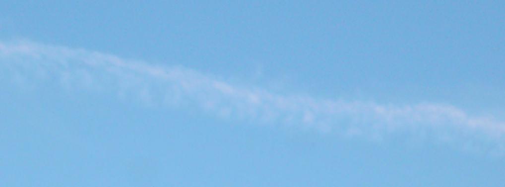 Am 26.06.04 beobachtete ich, wie ein Flugzeug ohne Kondensstreifen plötzlich einen schmalen Wolkenstreifen erzeugte und dieser Streifen nach wenigen Flugsekunden wieder abbrach. Daraufhin machte ich das erste Foto nachfolgender Fotoserie. Als dieses Flugzeug kurz darauf in die Nähe eines bereits von Chemtrails gebildeten Wolkenfeldes kam, erzeugte es den nächsten Flugstreifen, der nach Verlassen des Wolkenfeldes wieder abrupt abgebrochen wurde. Ein weiteres Bild zeigt, daß das Flugzeug ohne Kondensstreifenbildung weiterflog - also beide von ihm hinterlassenen Flugstreifen wohl kaum widerlegbar durch gezieltes Sprühen künstlich erzeugt und wieder abgebrochen wurden.