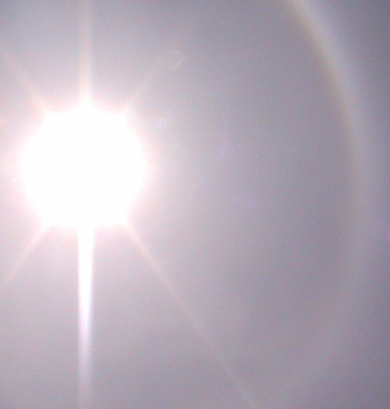 Lässt sich die Sonne irgendwo zwischen den Schwaden noch ausmachen, so ist sie oft von einem Lichthof umgeben, in dem sich ein blasser Regenbogeneffekt wahrnehmen lässt. (Dieser Effekt ist auf die Brechung des Lichtes im Aluminiumpulver, das heißt, der von den Flugzeugen ausgebrachten chemischen Streifen, zurückzuführen).