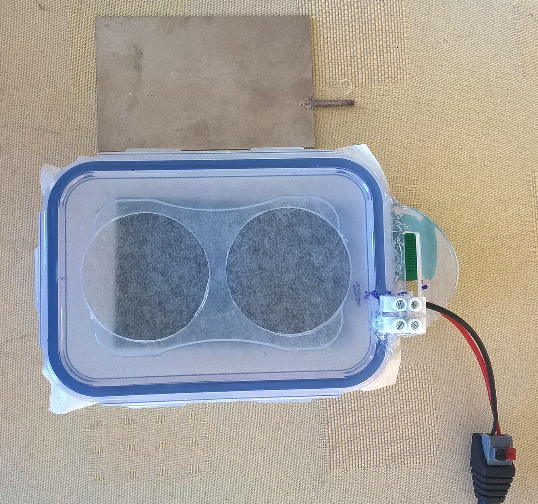 Bildbeschreibung der Dose von oben: Im Deckel befinden sich zwei runde Ausschnitte, die mit einem 50 mm-Kreisbohrer ausgeschnitten wurden. Neben dem Gehäuse liegt die Titankathode.